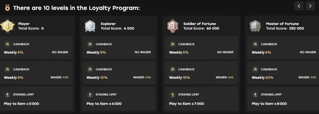 | Rank | Daily Cashback (No Wager) | Weekly Cashback (No Wager) | Staking Multiplier |